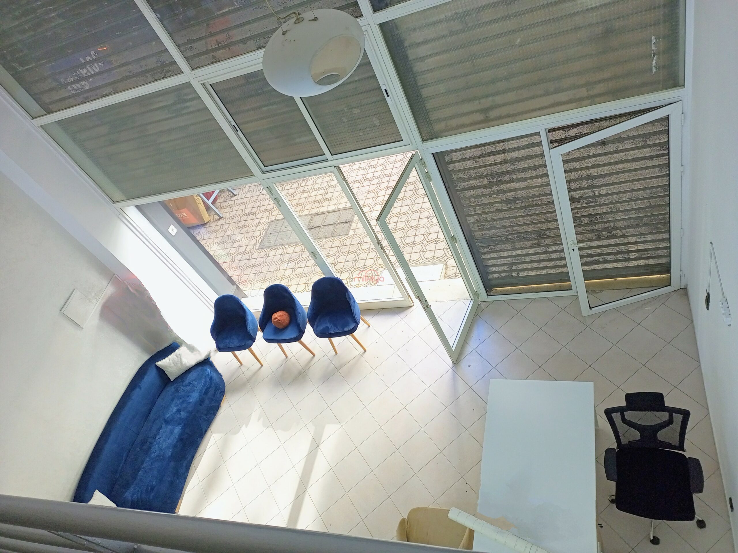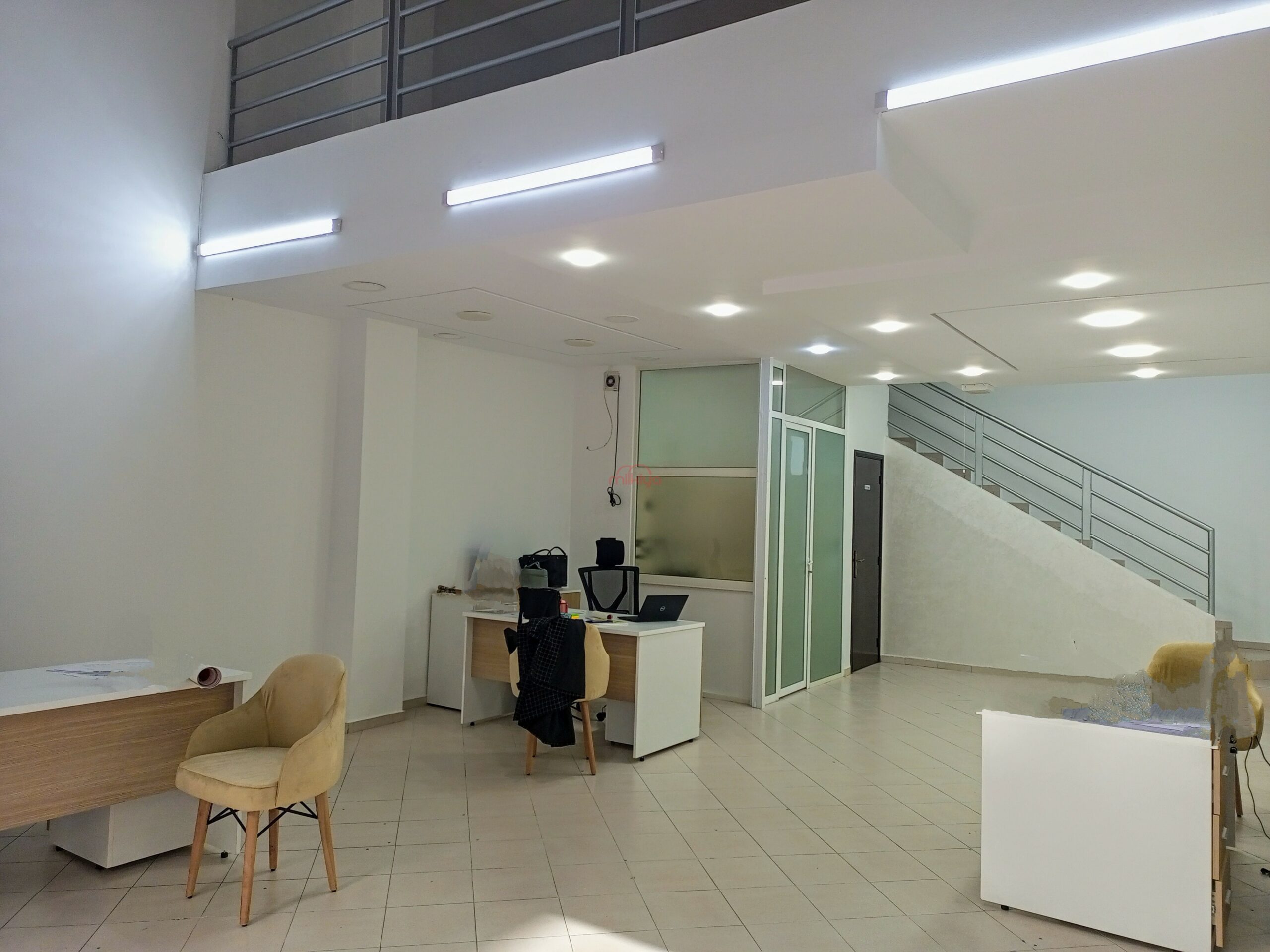 Il dispose d’une surface au sol de 64m² et 36m² en mezzanine, avec espace sanitaire et kitchenette au RDC ainsi qu’un espace de stockage en mezzanine. Une gaine d’extraction est préinstallée.