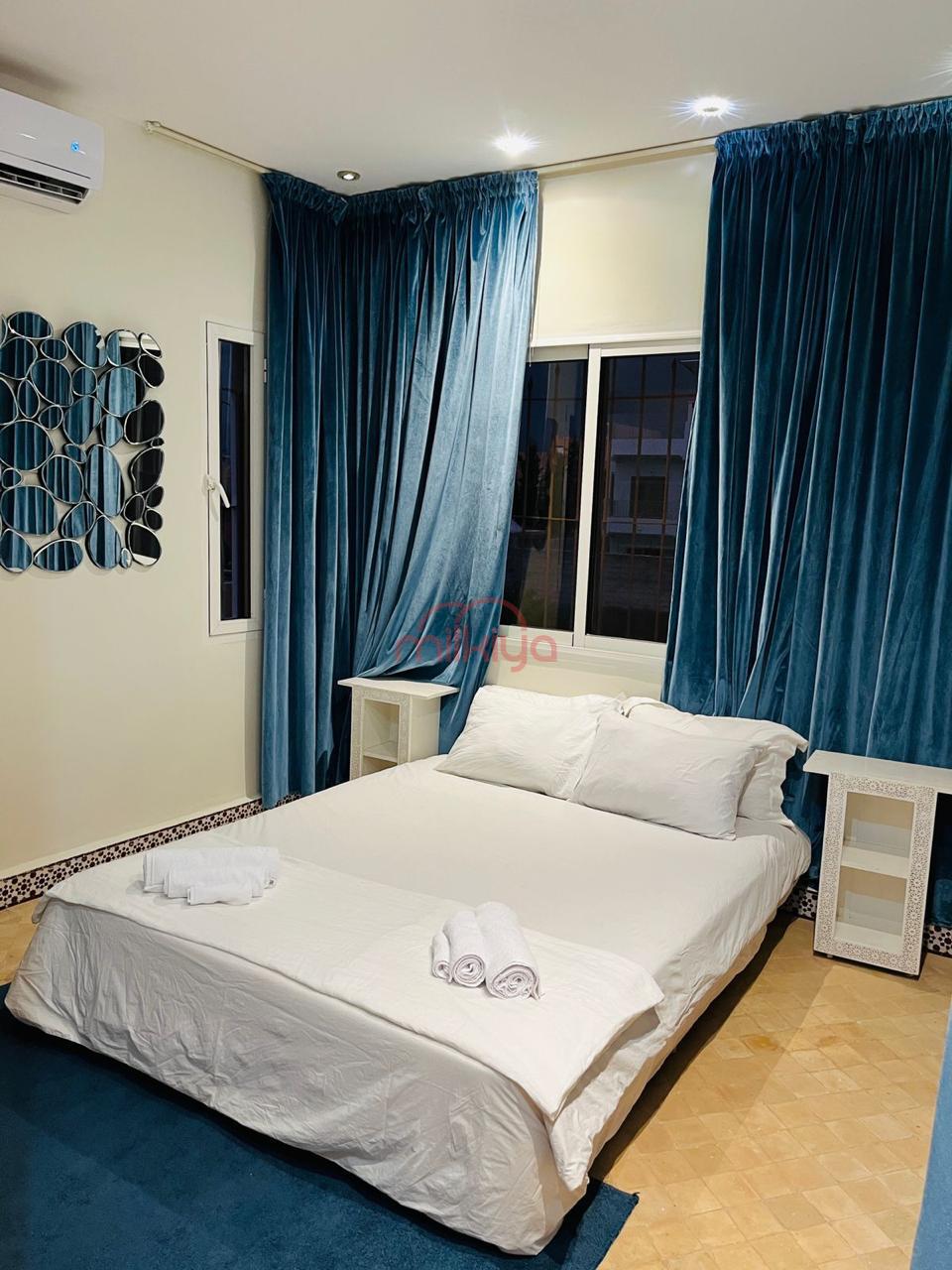 La villa se compose de cinq chambres climatisées, chacune avec sa propre salle de bain. La suite parentale à l’étage dispose d’un lit kingsize, d’un grand dressing et d’une salle de bain avec baignoire balnéo. Les autres chambres offrent de belles vues sur le jardin, les oliviers ou les montagnes de l’Atlas.