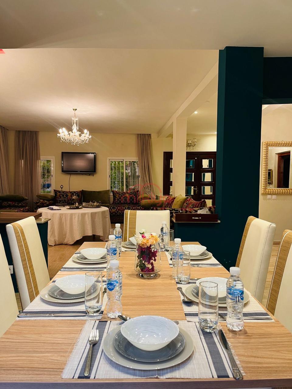 Les espaces de vie sont spacieux et lumineux : deux salons (marocain et européen), une salle à manger, une grande terrasse couverte, un jardin fleuri et une piscine privative avec transats, parasols et coin barbecue. Un hammam traditionnel et une terrasse de toit de 70 m² avec vue panoramique complètent les prestations.