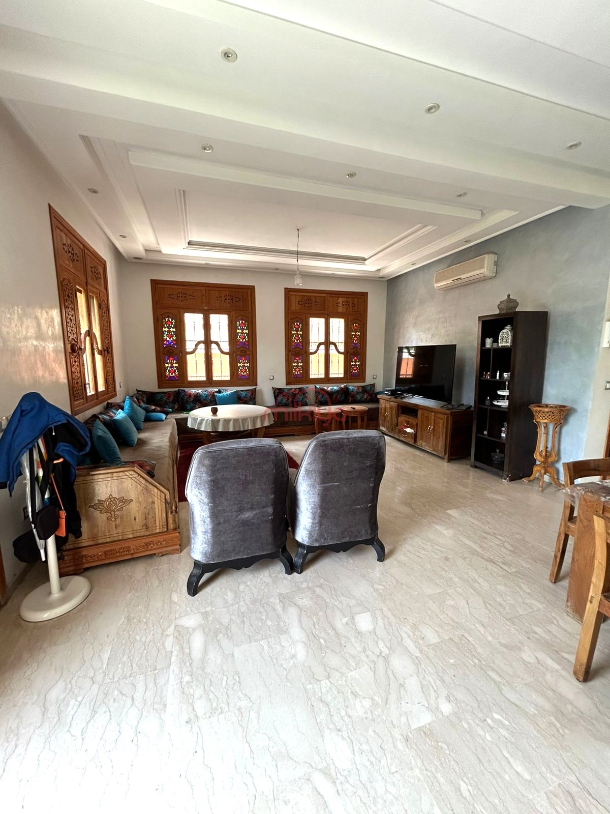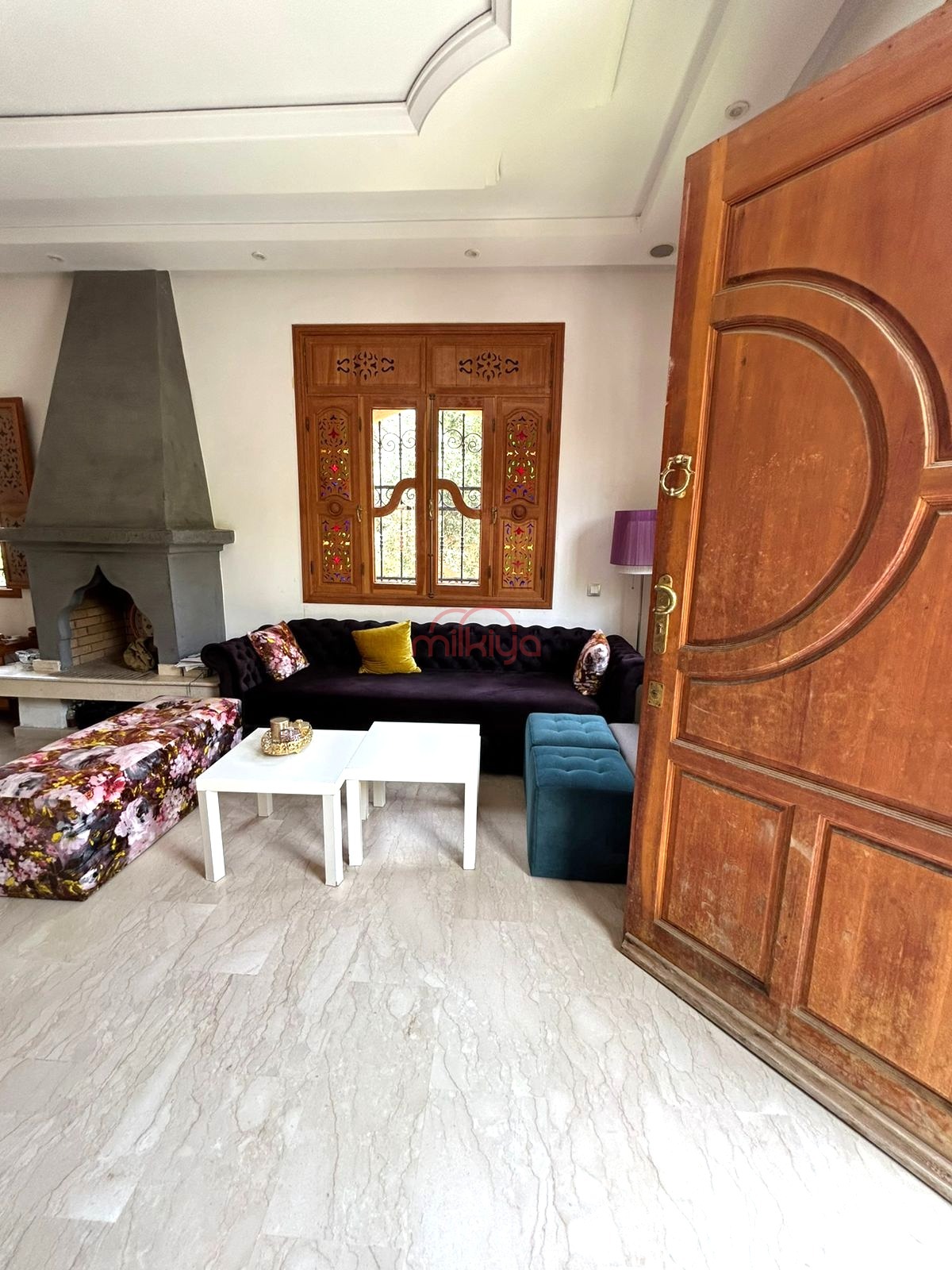 Au rez-de-chaussée (150 m²), elle offre un grand salon marocain, un salon européen avec coin cheminée, une cuisine, des toilettes invités et un espace réception avec double vasque.