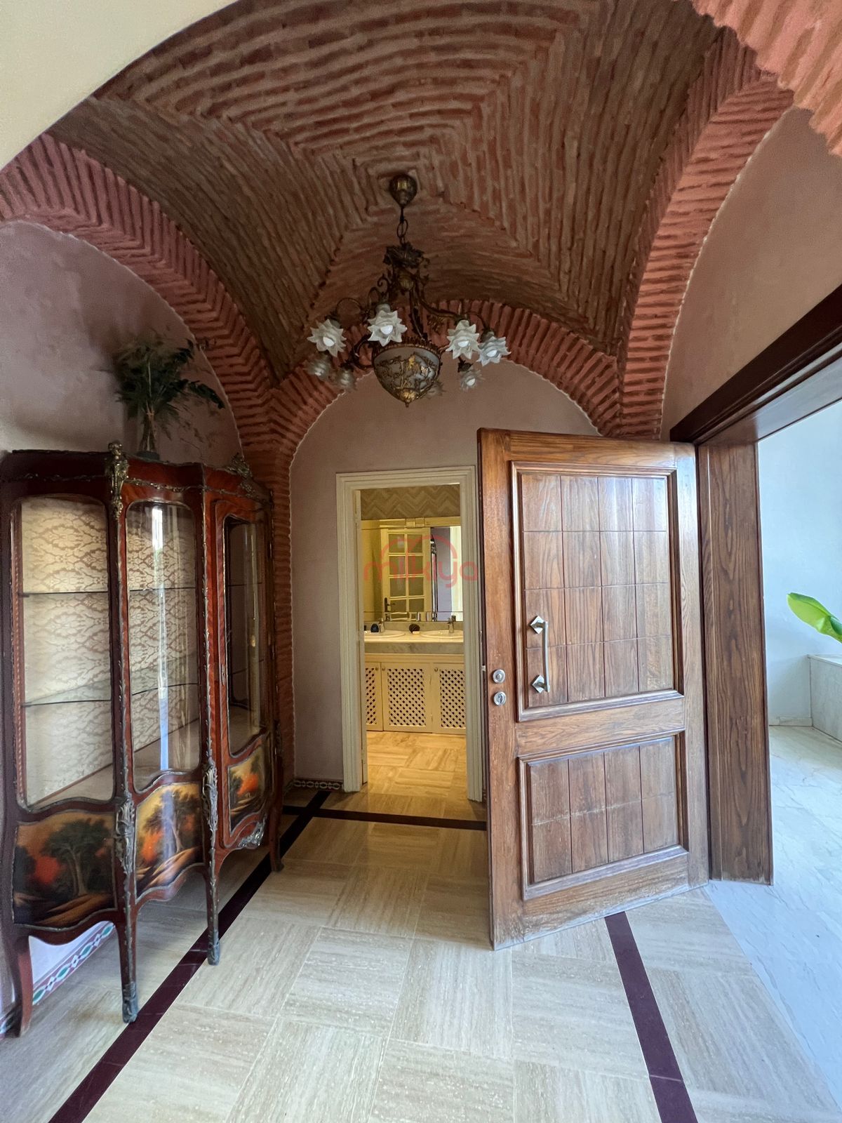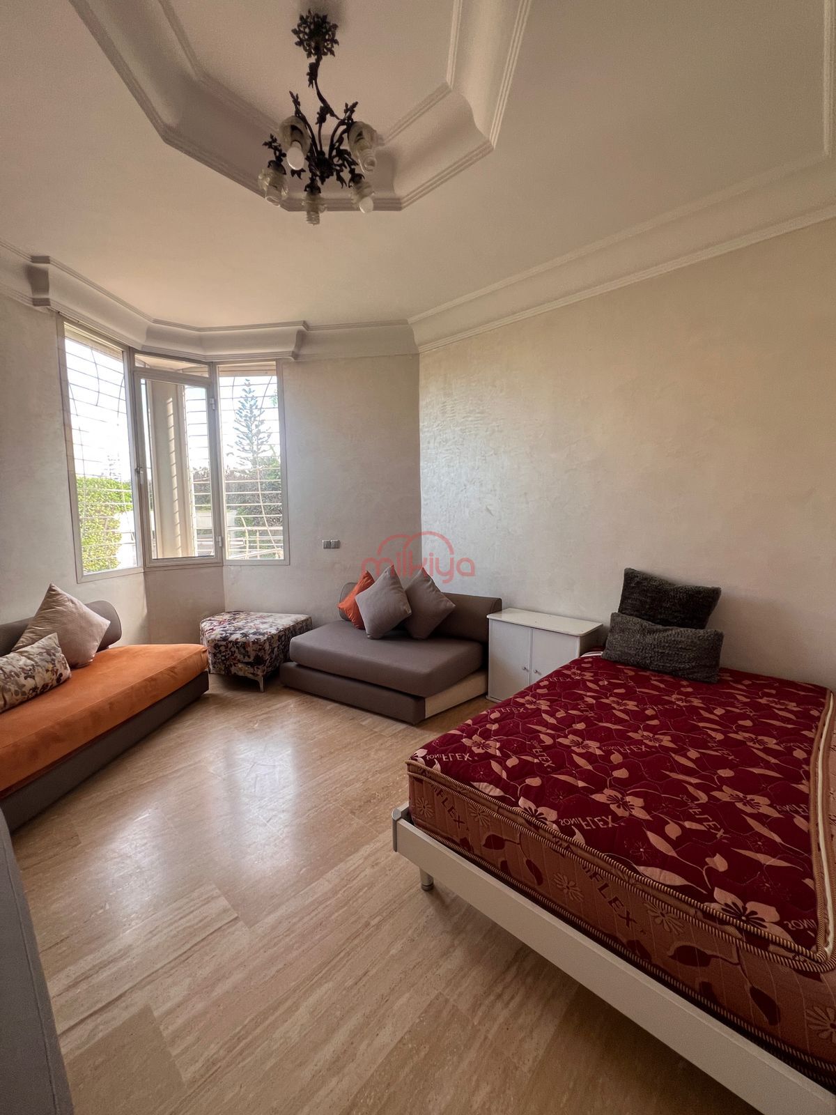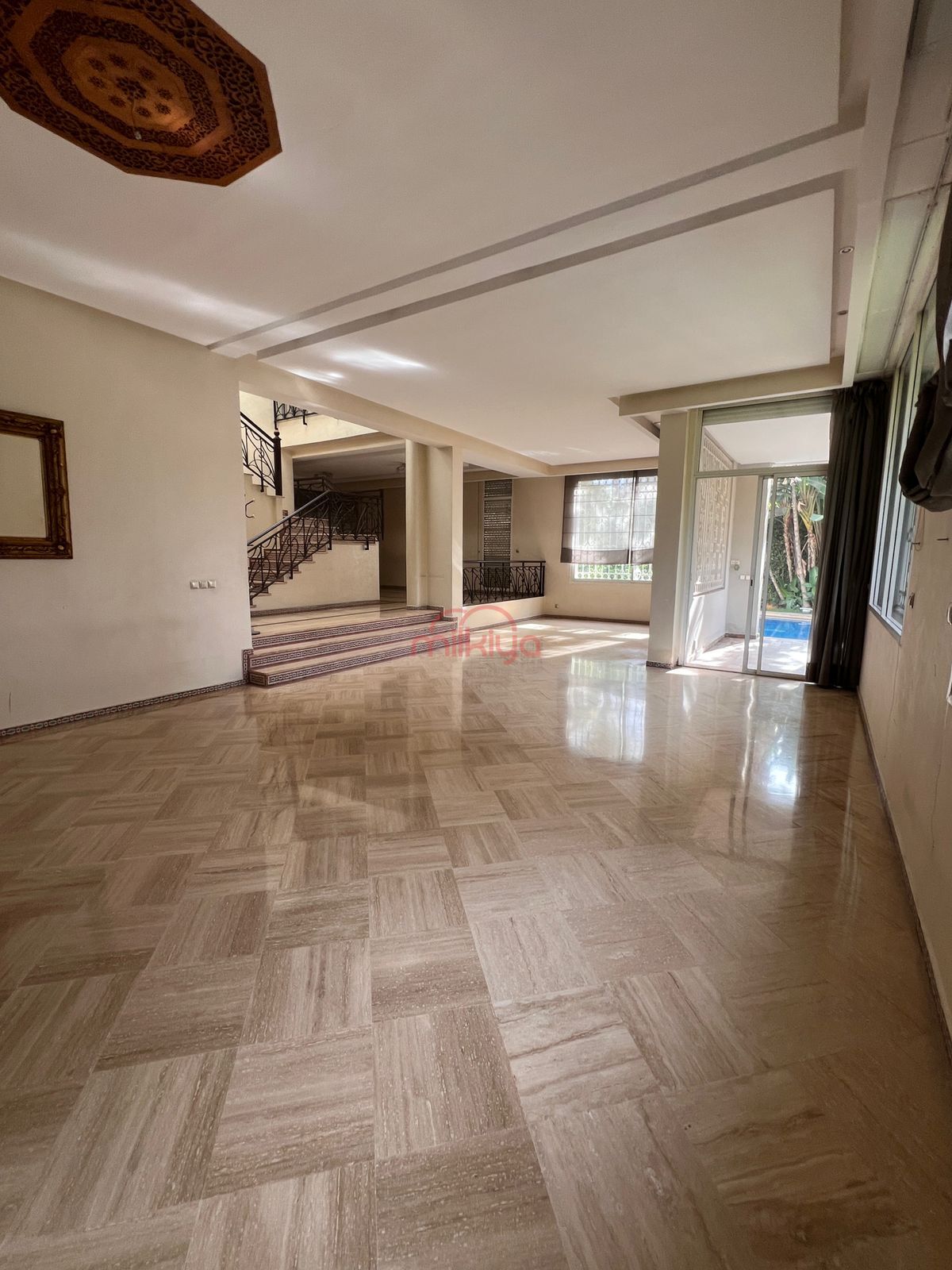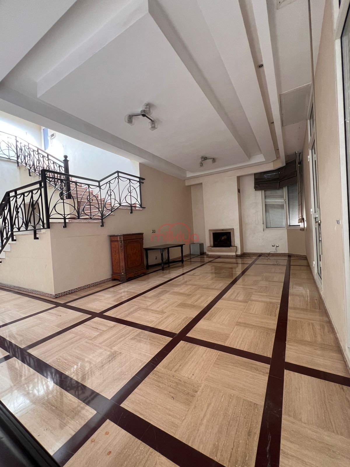Intérieur : Triple séjour ouvert avec cheminée, un salon marocain indépendant et une salle d’eau.