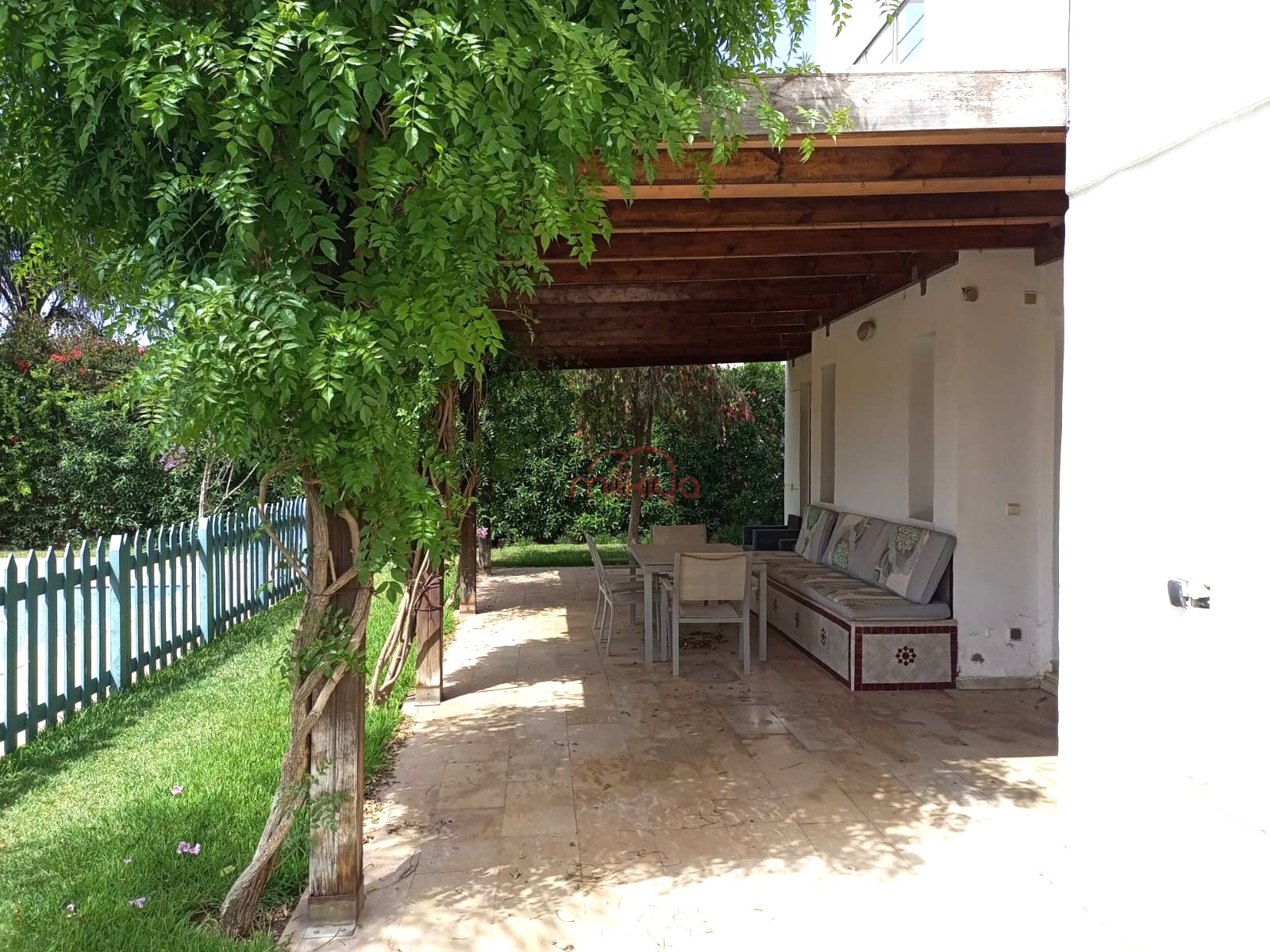 L’extérieur comprend : un grand parking pouvant accueillir deux voitures, une dépendance avec chambre, salle de bain et cuisine, un jardin arboré, bien entretenu, entourant la maison, une grande piscine, ainsi qu’une jolie pergola.